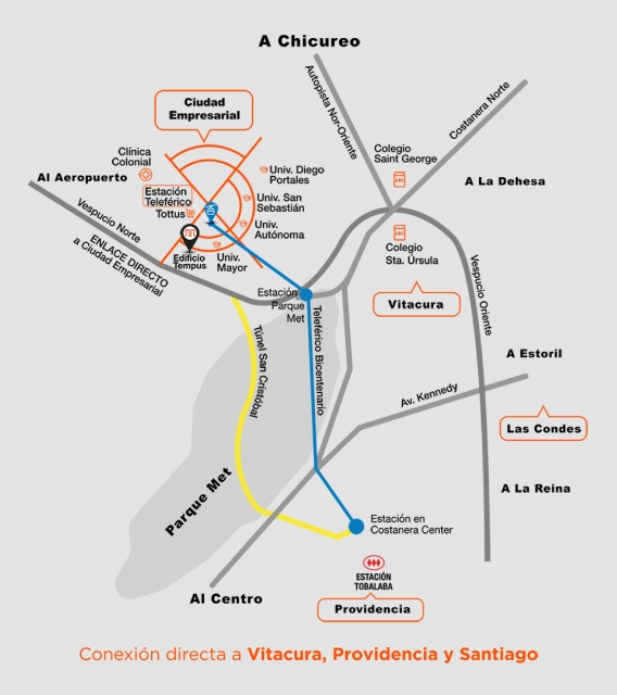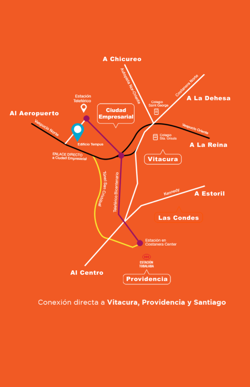Porque Ciudad Empresarial es un barrio consolidado con conexión directa a la nueva Autopista Américo Vespucio Oriente, Radial Nororiente, Costanera Norte, Túnel San Cristóbal y Teleférico a partir de 2026. Tempus está cerca de todo 15 minutos del Metro Tobalaba (2026) 10 minutos de Barrio El Golf 10 minutos del Parque Arauco y Costanera Center 25 minutos del Aeropuerto 15 minutos del Centro de Santiago